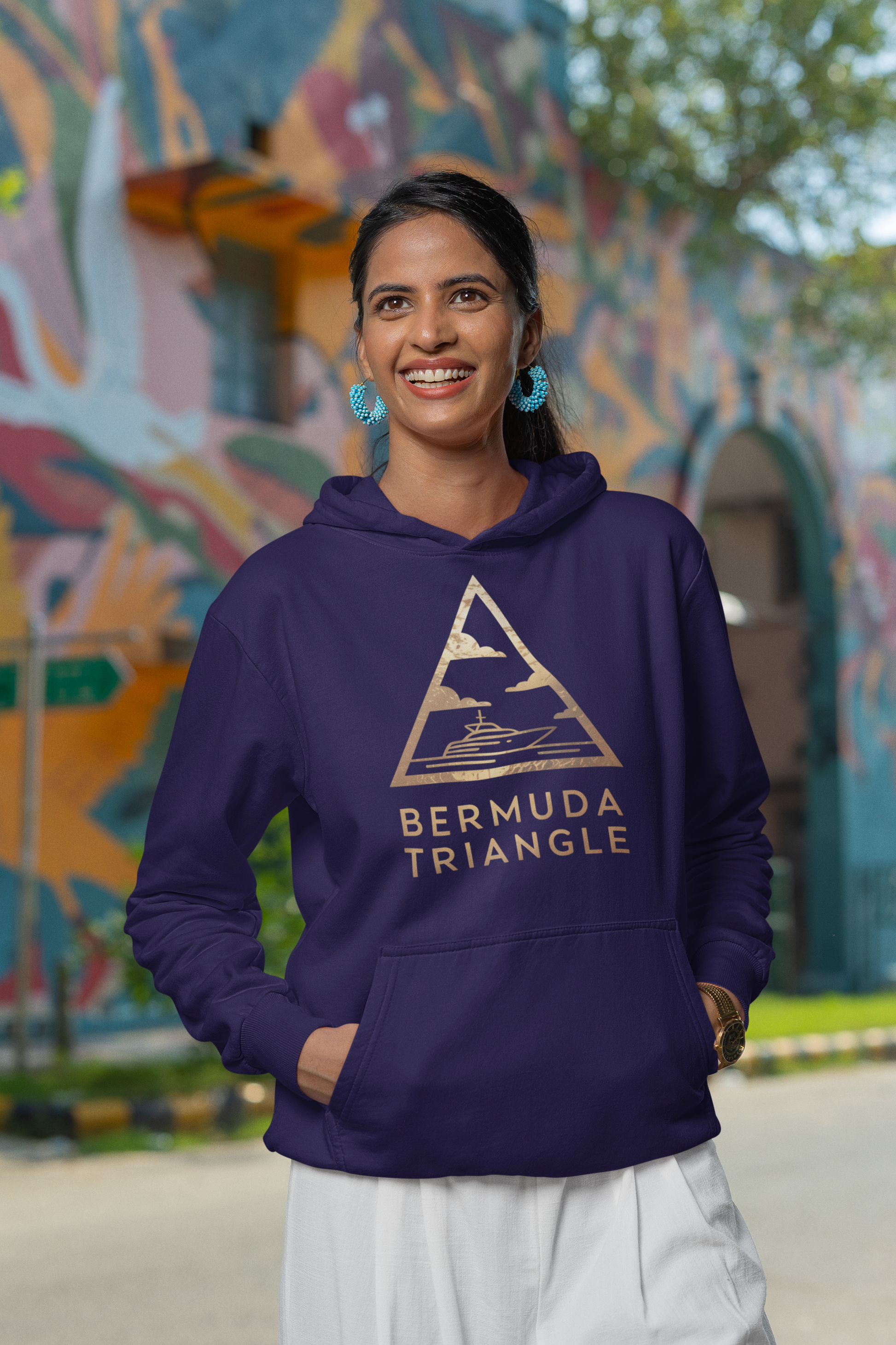 Luxurious gold foil Bermuda triangle emblem on a black premium hoodie with a yacht club aesthetic. Perfect for those who appreciate minimalist designs and high-end resort vibes. Ideal for adults looking for a cozy and stylish hoodie for casual or special occasions. Relevant for holidays, parties, and casual gatherings.